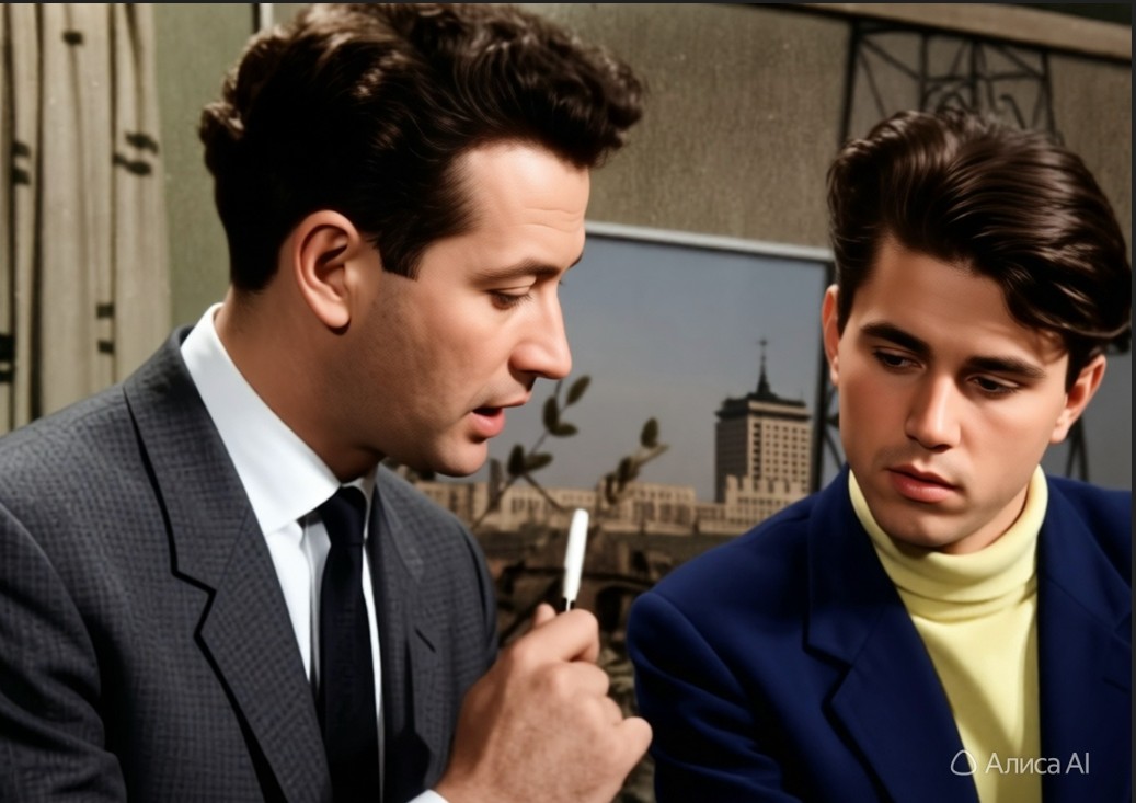 В.П. Галкин обсуждает замысел телепередачи. Фото реконструировано с помощью ИИ.